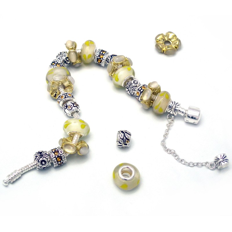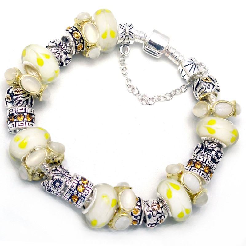 Výrazný šperk z nové kolekce náramků "design by SIRAPI". Náramek "Sun" je doplněn přívěsky, které jsou osazené krystaly, ale také má krásné ručně zdobené žluto-bílé přívěsky vyrobené z muránského skla. Pořiďte si krásný letní šperk a buďtě in.