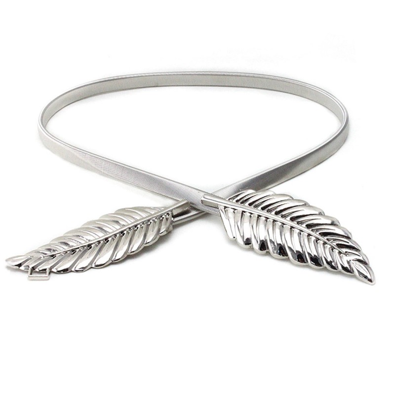 Pružný, úzký stříbrný opasek s výraznější sponou ve tvaru dvou lístků skvěle a dokonale dozdobí vaše plesové i letní šaty. Jemný opasek se dá také použít i na oživení blůzky. košile nebo i trička.